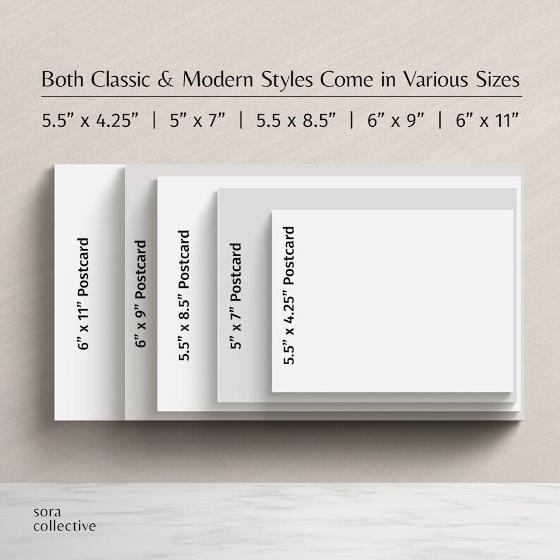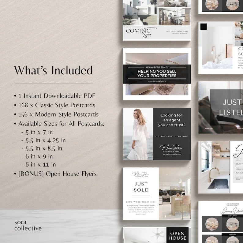 Our Postcard package Includes: - 1 downloadable PDF immediately upon purchase - 320+ Pre-Designed Real Estate Postcards - 168 x Classic Style Postcards - 156 x Modern Style Postcards - Both Classic & Modern Styles come in various sizes: - 5.5” x 4.25” - 5” x 7” - 5.5” x 8.5” - 6” x 9” - 6” x 11” - BONUS Open House Flyers in printable 8.5 x 11 format - Customer Support Available