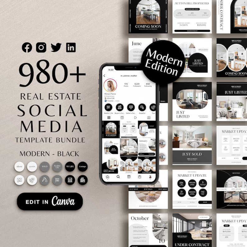 Real Estate Marketing Templates Bundle, Real Estate Social Media, Real Estate Instagram Posts, Realtor Canva Templates Highlight Covers